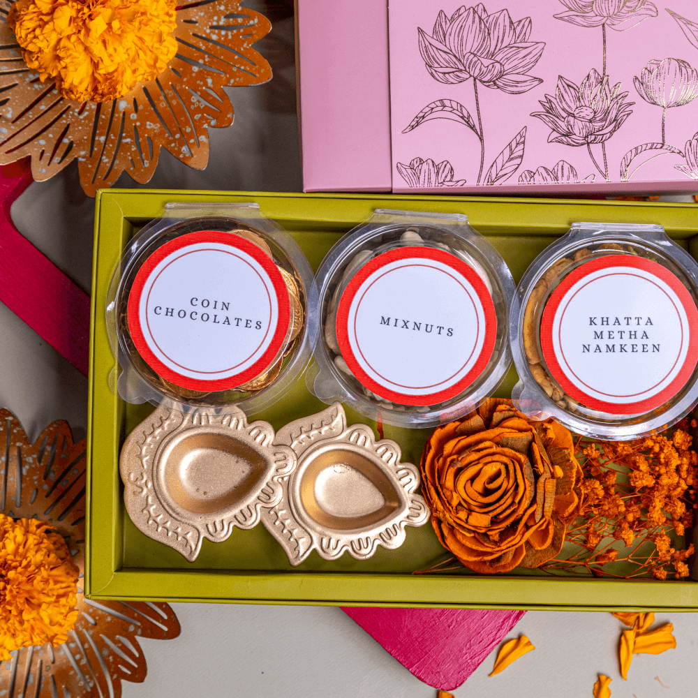 • COIN CHOCOLATE • MIXED DRYFRUITS • KHATTA METHA NAMKEEN • SET OF 2 METAL DIYA’S. • DRYFLOWERS •HAPPY DIWALI GREETING CARD • GIFT BOX
