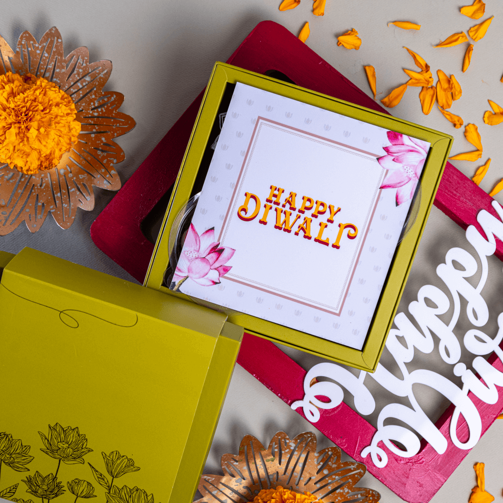 • MIXED DRYFRUITS • COIN CHOCOLATES • HANDCRAFTED WOODEN CANDLE HOLDER • HAPPY DIWALI GREETING CARD • REUSABLE GIFT BOX